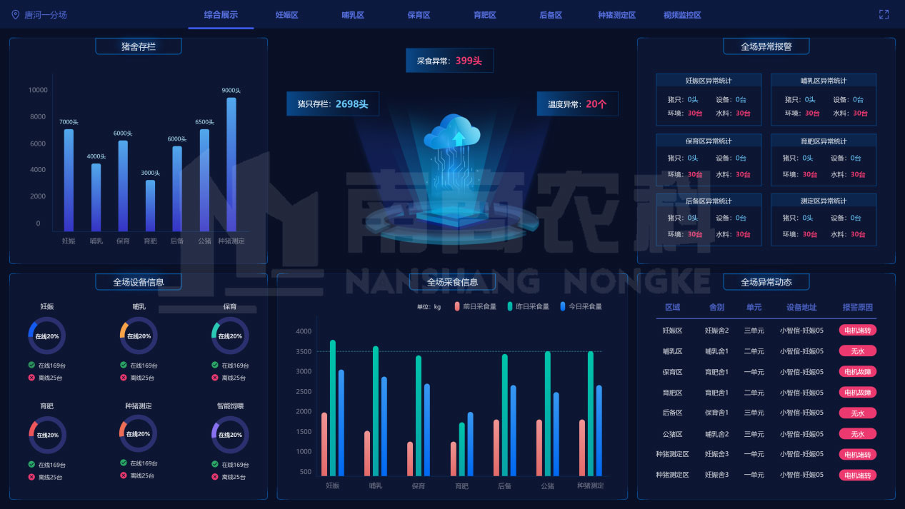 在重慶琪金集團(tuán)所屬的榮昌豬資源保護(hù)場(chǎng)和擴(kuò)繁場(chǎng)中,老板只需在手機(jī)上打開(kāi)南商云數(shù)據(jù)管理系統(tǒng),通過(guò)簡(jiǎn)單的操作后就可以清楚地了解豬場(chǎng)各方面的數(shù)據(jù),比如設(shè)備運(yùn)行狀態(tài)、豬只的采食數(shù)據(jù)、豬場(chǎng)能耗、溫濕度、豬只采食異常、設(shè)備異常、供料供水異常報(bào)警等都可一手掌握,還能一鍵下發(fā)飼喂方案: