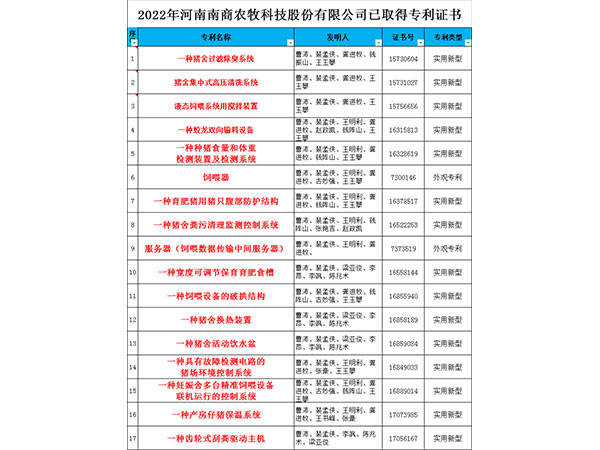 今年未完,南商農(nóng)科就獲得了17項發(fā)明專利;從2009年到2022年,南商農(nóng)科研發(fā)團隊已經(jīng)取得了80余項國家專利,20余項軟著,歷經(jīng)4代產(chǎn)品升級,先后研發(fā)了種豬測定站、小智倌妊娠、哺乳、保育育肥一體機等6大系列全套智能化養(yǎng)豬設(shè)備;?這些成就的取得是因為每一個南商人在平凡的崗位上踐行著不平凡的使命——做中國知名的智慧化豬場總包服務(wù)商。在以后南商人仍然會積極開展技術(shù)創(chuàng)新,用更多的發(fā)明專利、更加精良穩(wěn)定的設(shè)備,為南商的客戶創(chuàng)造更多的收益,提供更大的價值。 路漫漫其修遠兮,吾將上下而求索,面對不斷變化的行情趨勢、日新月異的養(yǎng)殖需求,南商農(nóng)科始終堅持誠信鑄就南商,科技創(chuàng)造價值的理念;獲得了“國家科學(xué)技術(shù)進步二等獎”、“神農(nóng)中華農(nóng)業(yè)科技獎”、“服務(wù)型制造示范企業(yè)”、“省級專精特新企業(yè)”、“小巨人